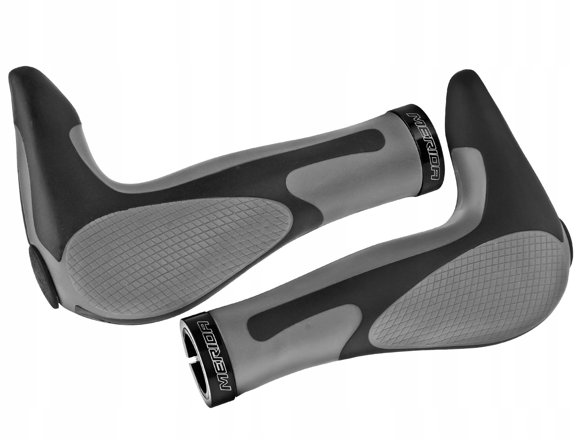 Uniwersalne chwyty kierownicy z rogami marki MERIDA - idealne do rowerów MTB i trekkingowych, doskonale amortyzują wstrząsy przenoszone na dłonie rowerzysty.