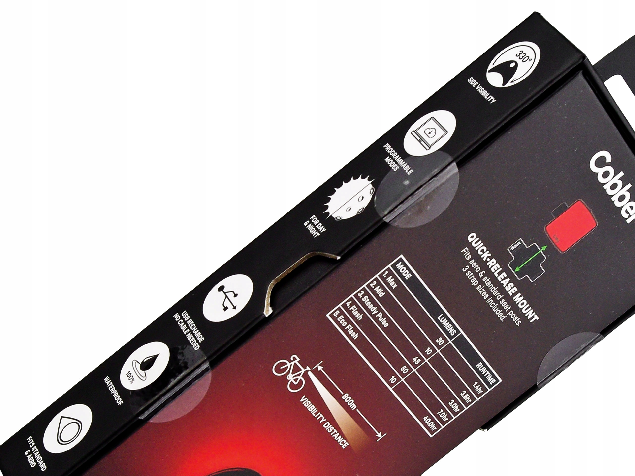 Moc maksymalna na poziome 50 lumenów czyni Cobbera jedną z jaśniejszych tylnych lamp na rynku.